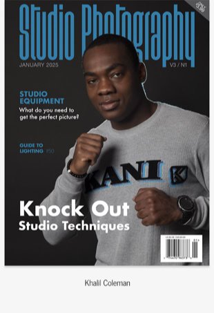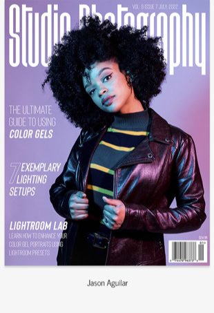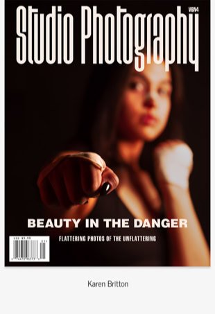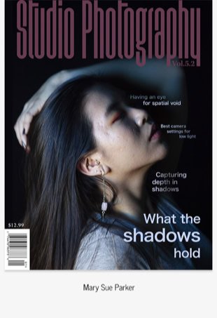 AGD 3020 is a digital studio photography class with artificial light—both continuous and strobe. Some projects involve a graphic design step after the custom photography, as is the case with this magazine cover. I provide the nameplate and the barcode. Concept, photography, copywriting, and layout are all created by the students.